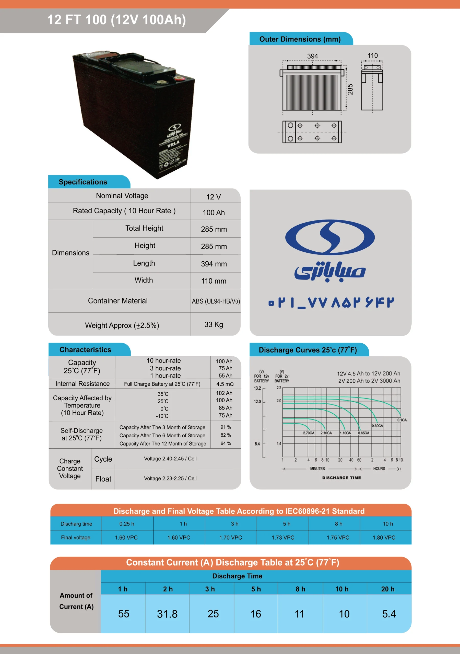 جدول مشخصات فنی باتری 100 آمپر UPS صبا