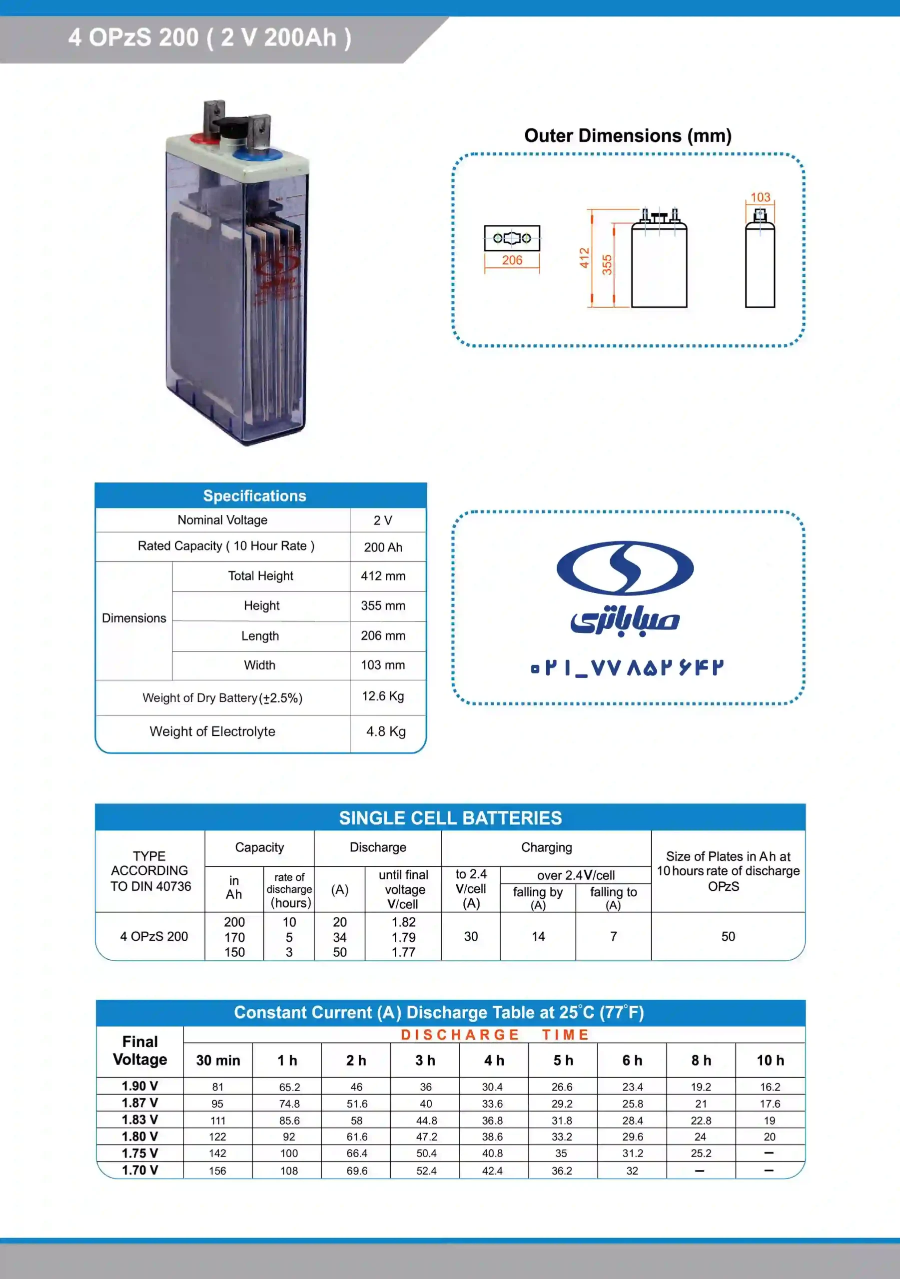 باتری 2 ولت 200 آمپر اسیدی OPZS صبا باتری