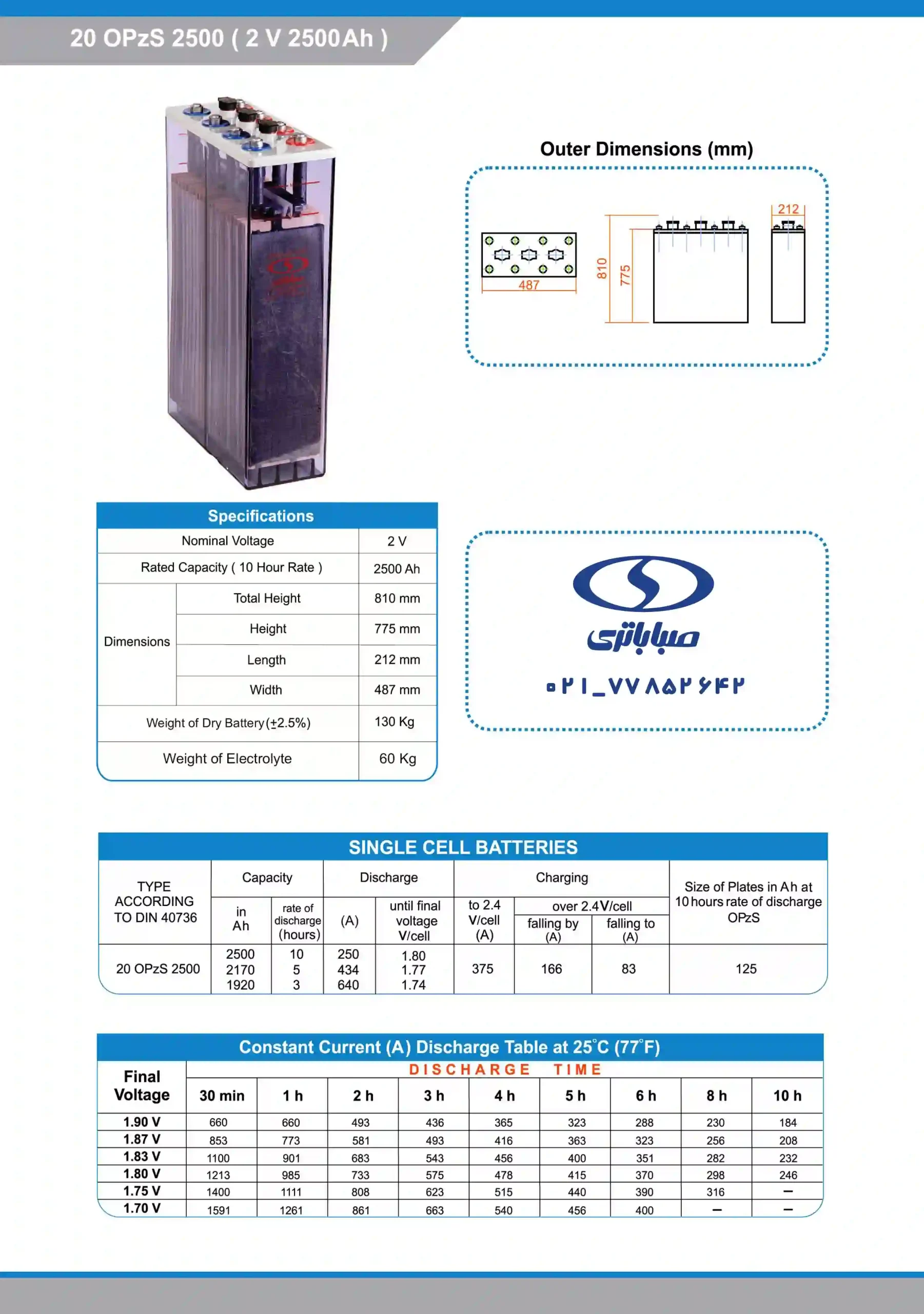 جدول مشخصات فنی باتری 2500 آمپر اسیدی OPZS صبا باتری